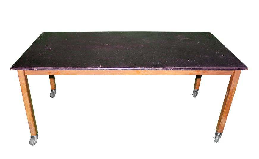 Rectangular, steel frame, rolling table painted light wood grain with black wood top.